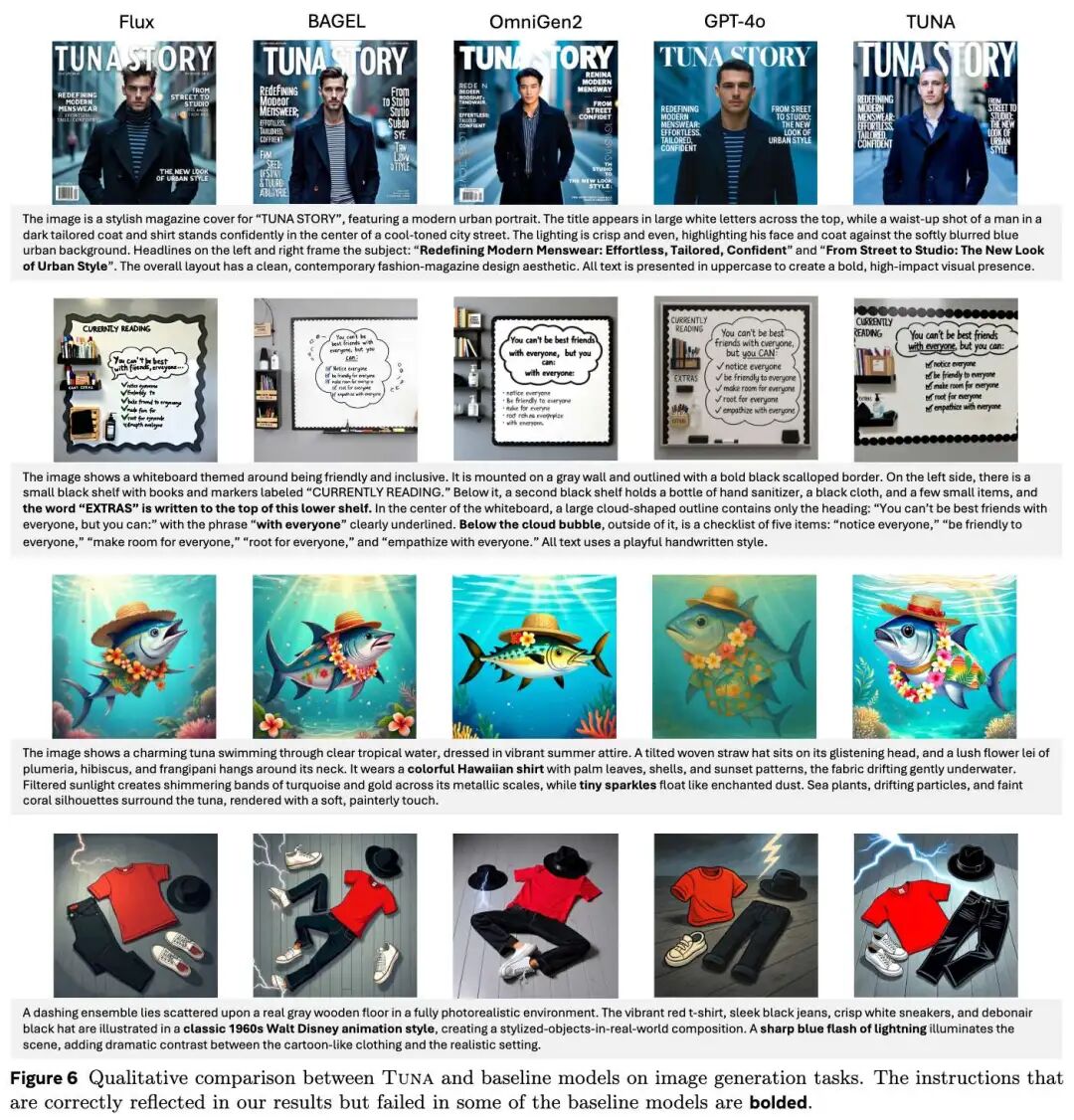 下图 6展示了 Tuna 在图像生成上的优势,特别是在组合性生成和文本渲染方面(例如正确拼写单词、按指示放置物体)。相比之下,其他模型经常出现拼写错误或物体遗漏。