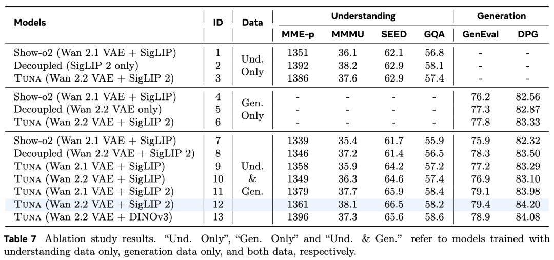 Tuna不仅超越了之前的 UMM 基线模型,而且与领先的纯理解和纯生成模型相比也具有竞争力。消融研究进一步表明:(1) Tuna 的统一表示空间优于 Show-o2 风格的统一表示和解耦表示设计;(2) 在该框架内,更强的预训练表示编码器始终能带来更好的性能;(3) 这种统一视觉表示设计实现了理解和生成之间的相互增强。