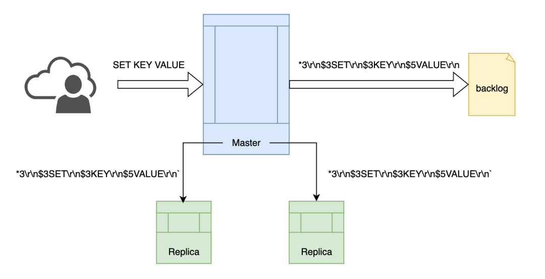 #define SLAVE_STATE_ONLINE 9 /* RDB传输完成 */ 当主节点接收到写命令时,会调用 replicationFeedSlaves 函数,向每个从节点对应的客户端输出缓冲区也写入一份同样的数据: