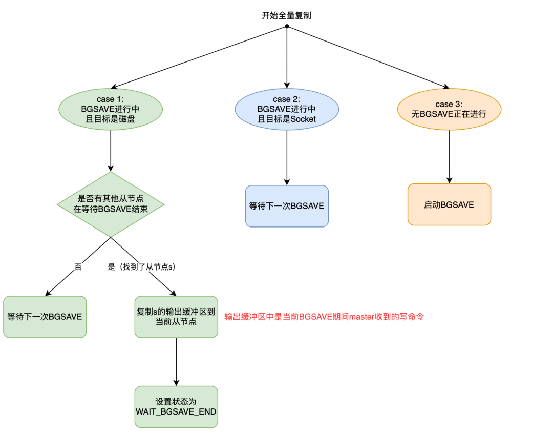 }从canFeedReplicaReplBuffer函数的实现中可以看到,只要从节点状态不是 SLAVE_STATE_WAIT_BGSAVE_START,写命令就会通过 addReply 系列函数添加到从节点对应的客户端输出缓冲区中。这意味着在以下状态下,命令都会被缓冲: