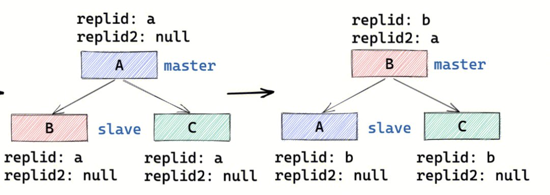 PSYNC2下主从复制 replid的变更流程详见下图。节点B在提主后将A的id记录在replid2中。申请同步时,A、C的replida与B的replid2a一致,因此能进行增量同步。同步后A、C的replid变更为新主的b。