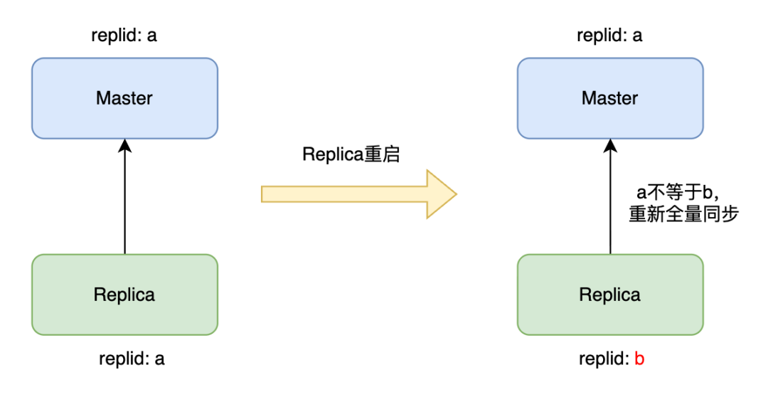 如上图所示,从节点重启后,replida丢失,生成了一个新的replidb,与主节点不一致,从而只能全量同步,尽管与主节点只有少部分数据不一致。