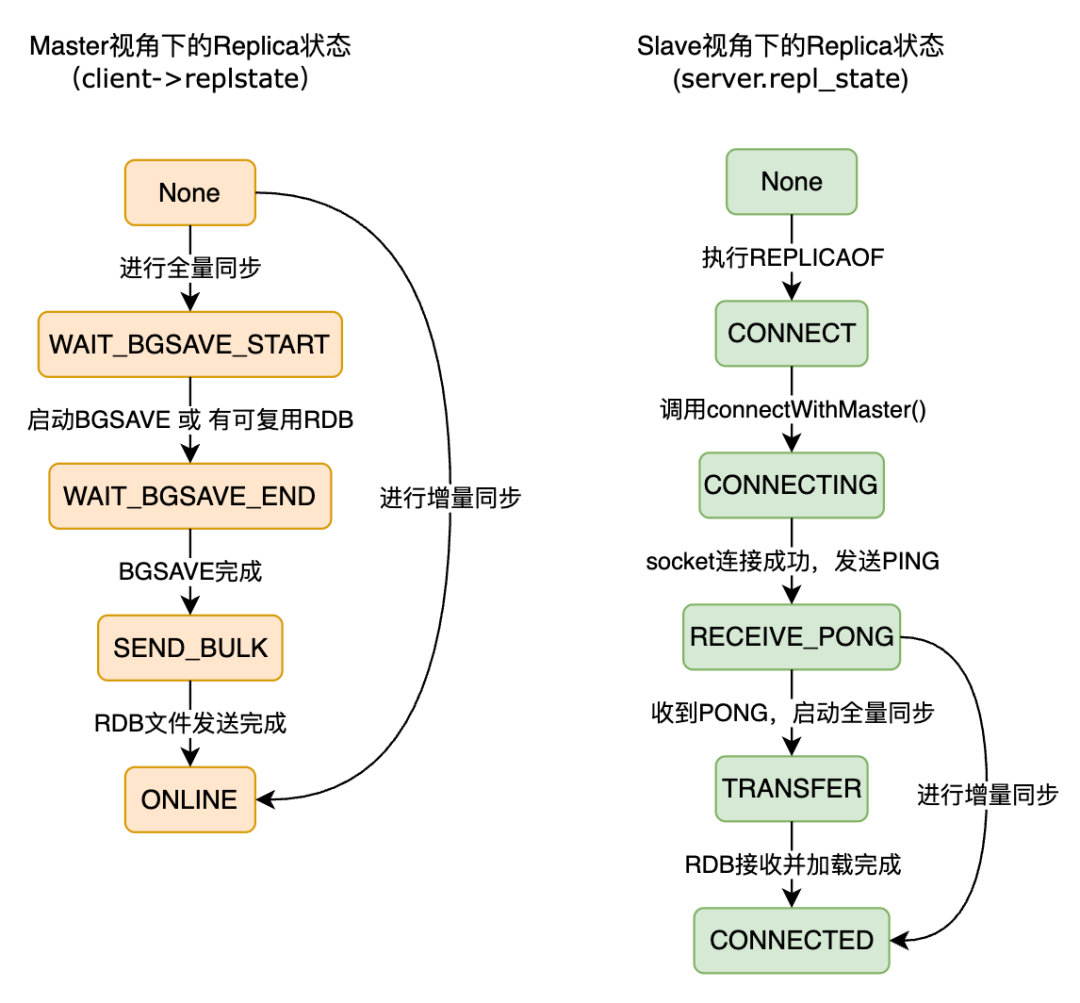 前面已经多次提到过Redis通过状态机来实现对主从复制流程的控制。图6是Redis主从复制状态机的示意图。由于主从复制同时涉及到主节点和从节点两个角色,因此主节点和从节点各有一套状态机。后面会讲到Redis的增量同步,它可以大大加快主从同步的速度。