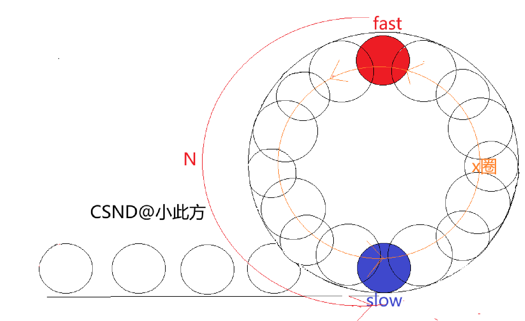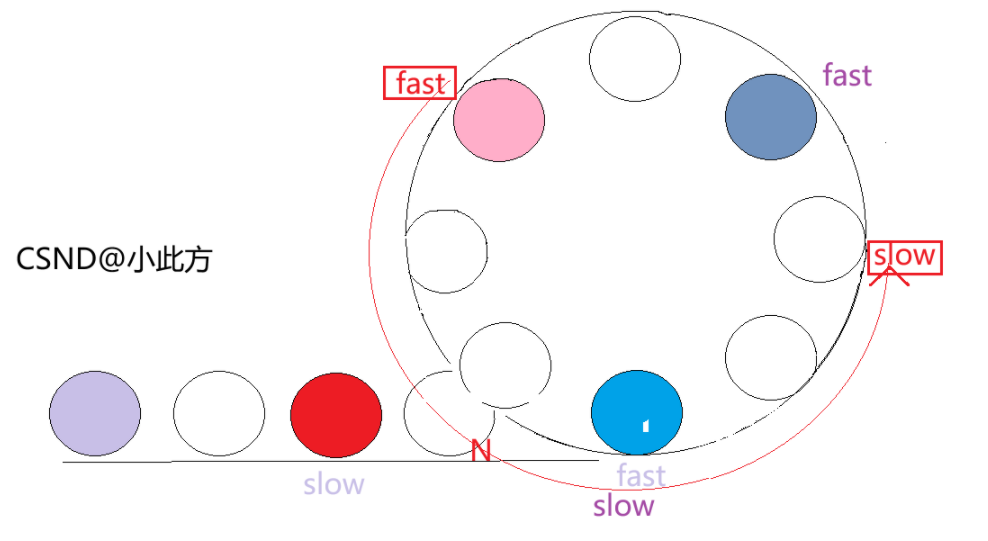 fast和slow的速度差为3-1=2。此时,我们需要对slow进入循环时(即追及问题开始时),fast到slow的距离N进行讨论。