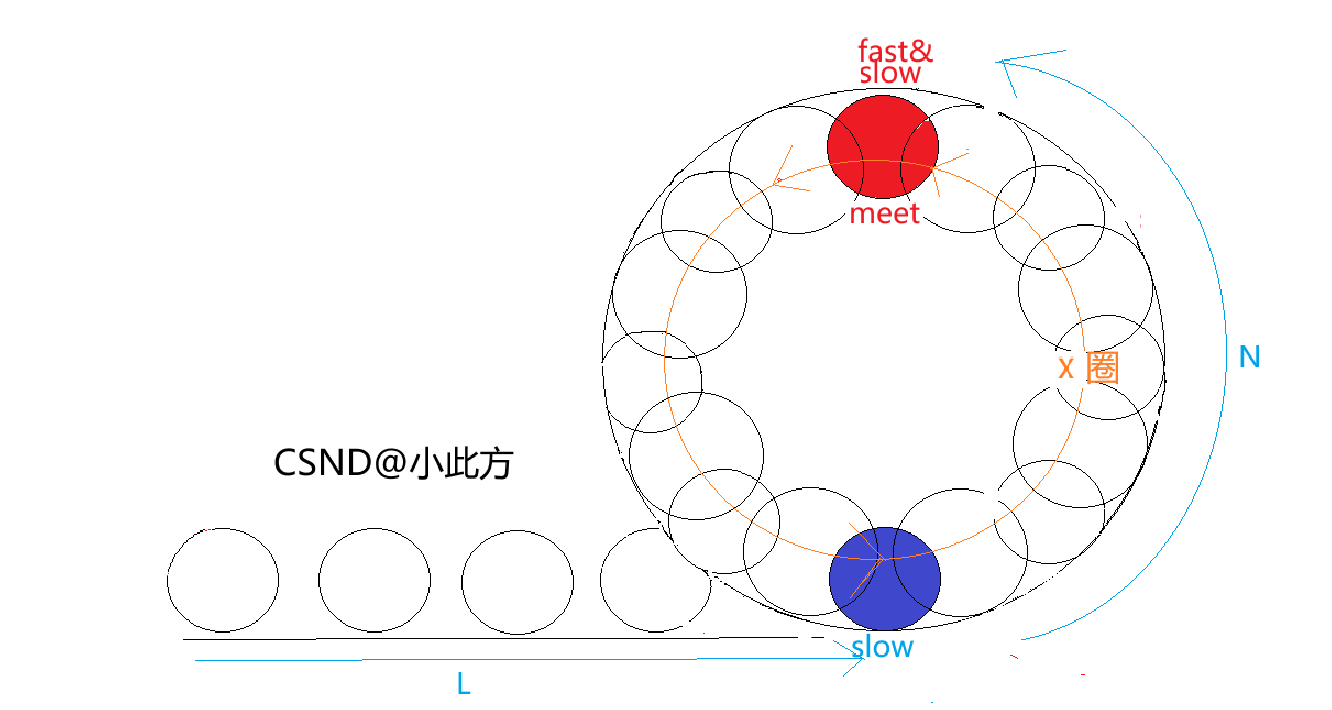 ● slow指针行走的路程是N+L。