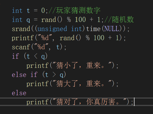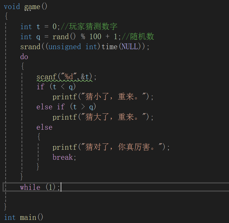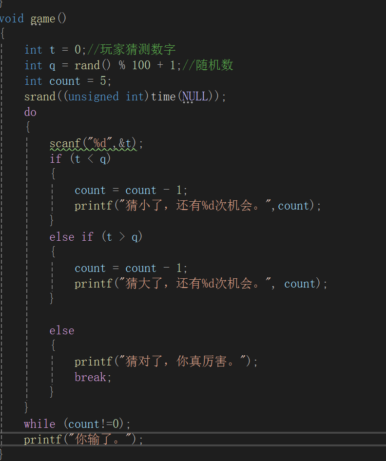 这里我使用了do while 循环结构,保证循环至少执行一次。将while的参数设置为1,使其可以无限进行下去直到猜对为止。