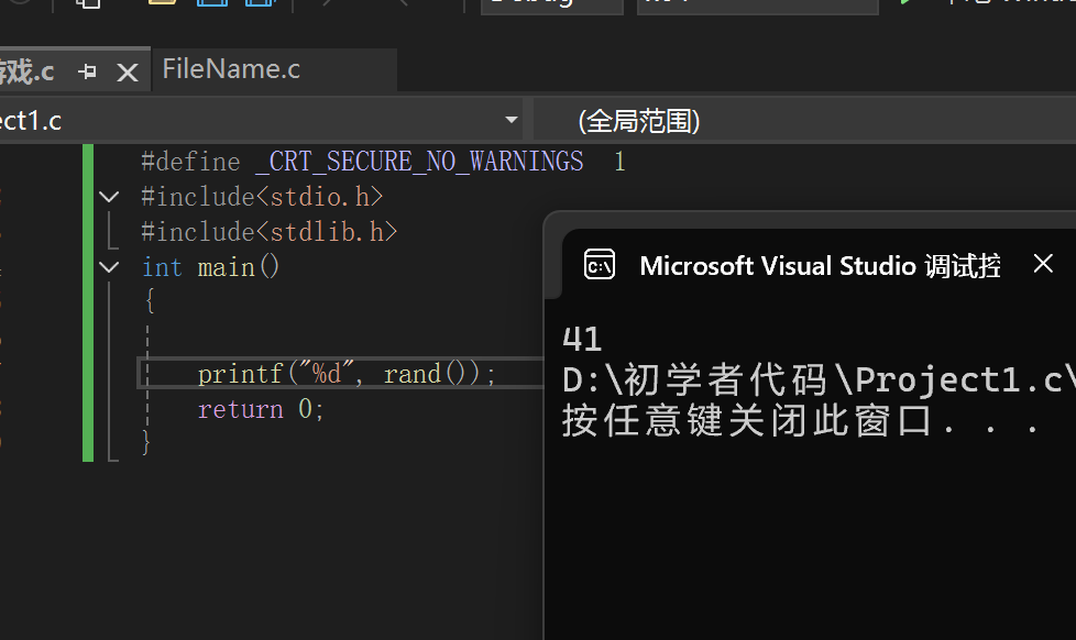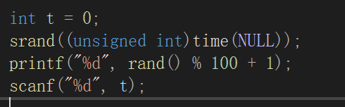 debug:1,删除了printf("%d", rand() % 100 + 1);语句,不在屏幕上显示随机数。