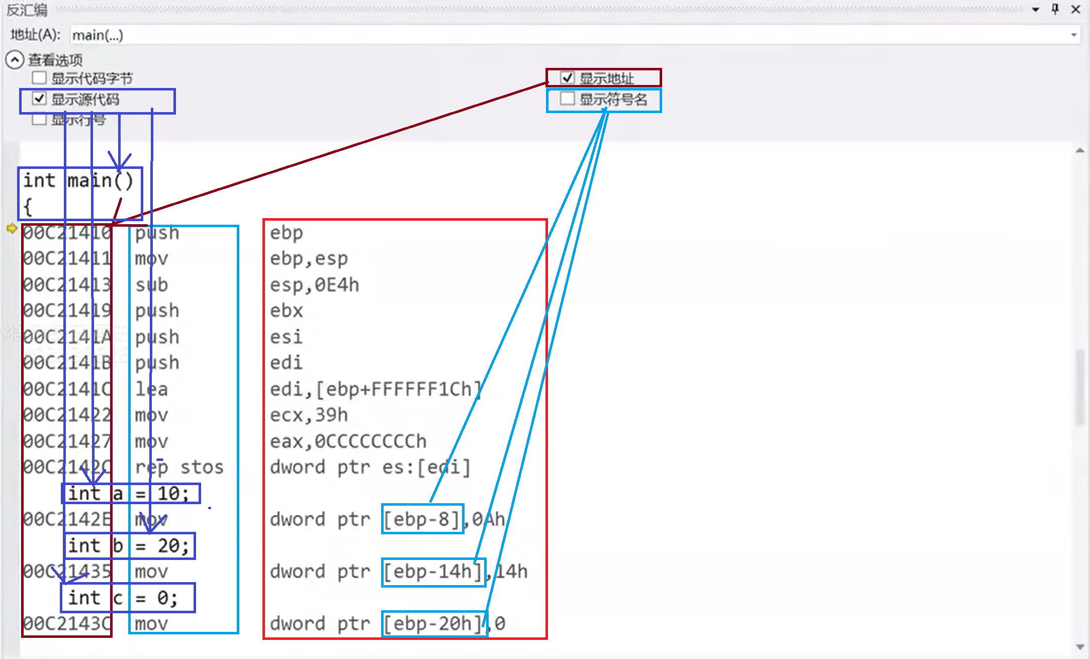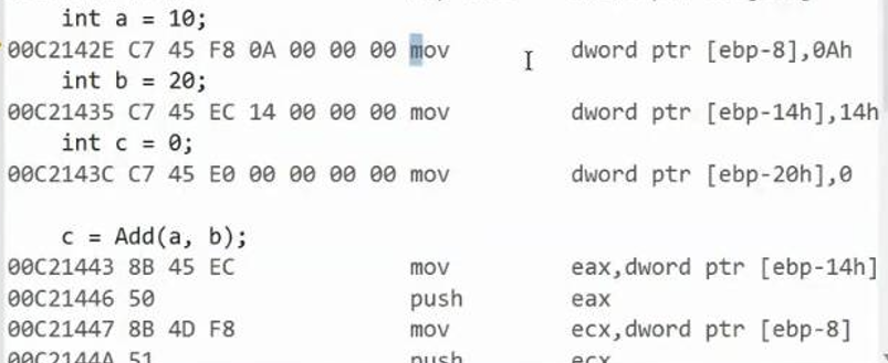为变量开辟空间:如图:我们为变量a,b,c分别在ebp-8h,ebp-14h,ebp-20h处创建空间,并赋值。赋值是关键!如果不赋值:当我们打印比如a的时候,我们实际上访问到的0CCCCCCCCh。