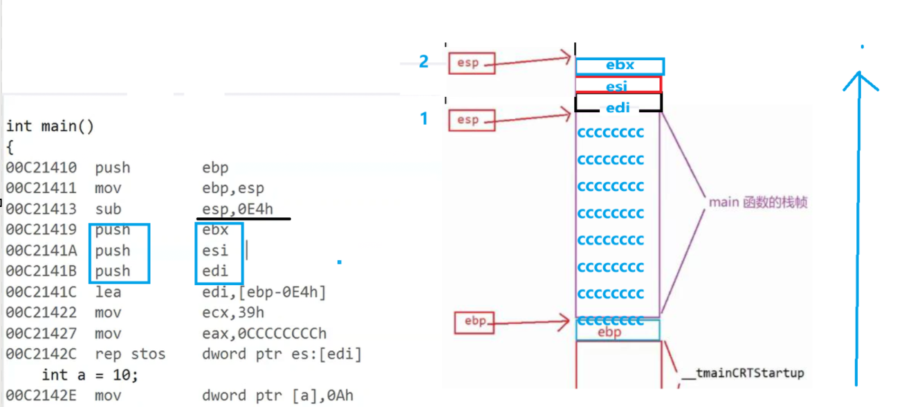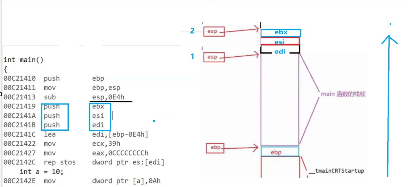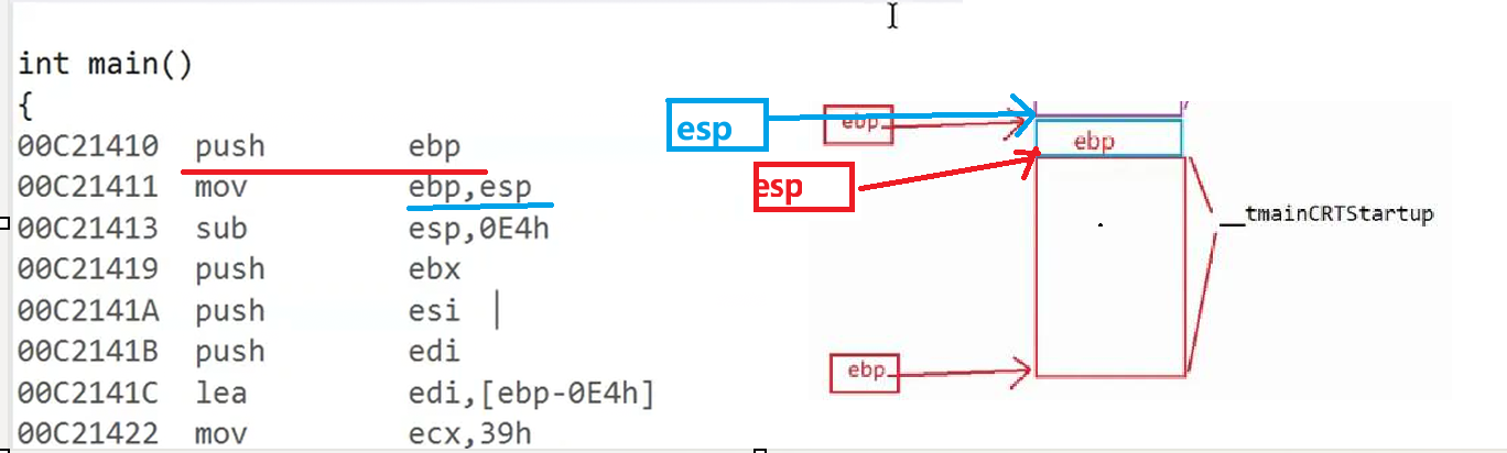 esp和ebp被用来维护 __tmainCRTStartup()函数的栈帧,。