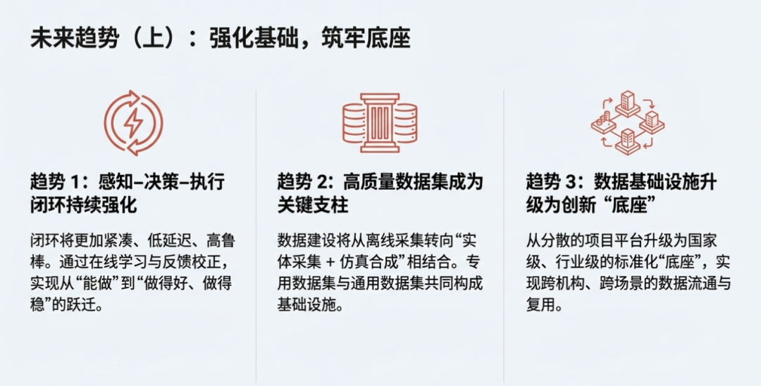 顺应和把握前文总结的六大趋势,是未来一段时期内各方协同发力的关键:研究界需要在低延迟闭环控制、跨模态认知模型和仿真–现实迁移等方向持续突破;产业界需要在数据采集、标注、基础设施和场景落地上形成可复制的工程经验;政府与监管机构则需要通过政策与标准,为数据要素的合规流通和价值实现提供良好制度环境。