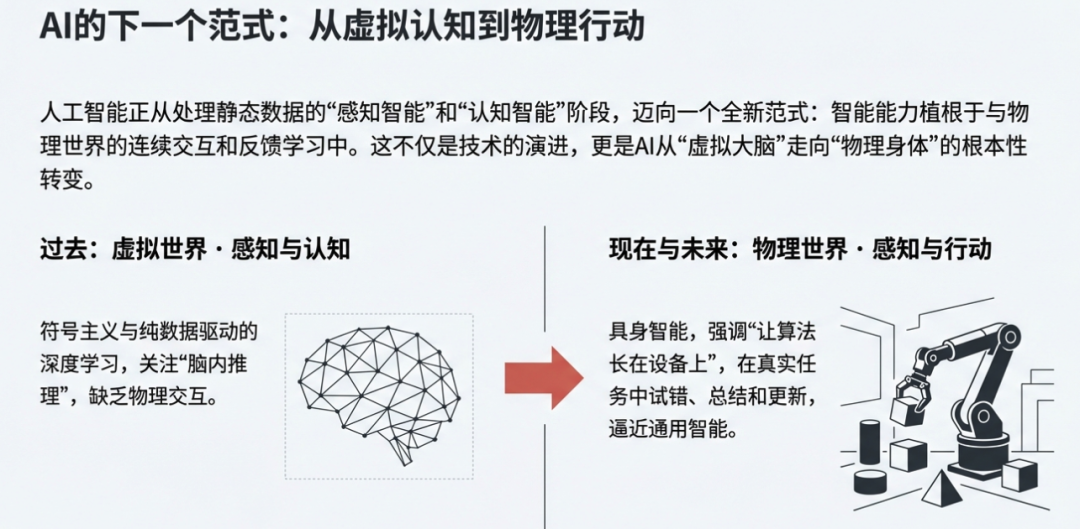 从人工智能发展史看,具身智能可以视为继符号主义和纯数据驱动深度学习之后的“第三条路径”。早期 AI 强调符号推理和专家系统,往往假设环境静态、规则完备;随后深度学习依托大规模静态数据取得突破,但对物理交互关注不足。随着机器人、传感器融合和强化学习技术的成熟,越来越多研究和产业实践转向“让算法长在设备上”:只有把智能安放在身体里、放入环境中,让它在真实任务中不断试错、总结和更新,才能逼近类人水平的通用智能。