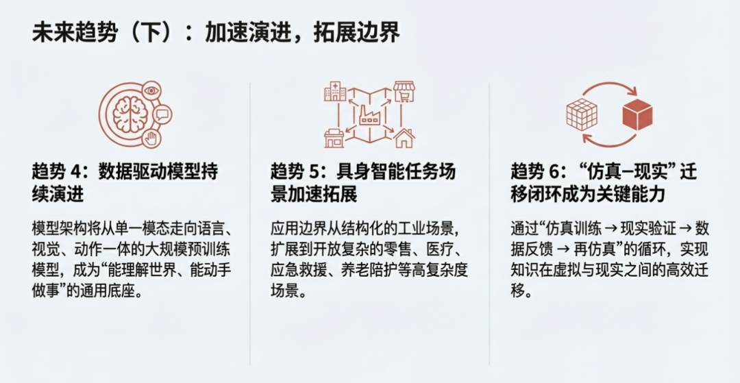 综合来看,这六大趋势从控制闭环、数据供给、基础设施、模型演进、应用场景到仿真–现实迁移,构成了具身智能与数据要素融合发展的“六维坐标”。它们相互支撑、彼此强化,最终指向一个共同目标——培养具有更强自主性和环境适应性的智能体,使其成为推动实体经济升级和社会治理现代化的重要新质生产力。