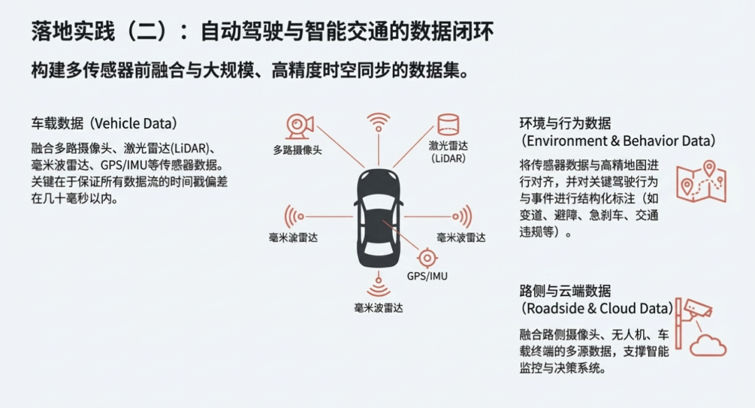 在自动驾驶与交通执法场景,需要构建融合多摄像头、激光雷达、毫米波雷达、GPS/IMU 等传感器的数据集,同时配以高精地图和丰富的行为与事件标注(如变道、避障、急刹车等);在交通执法与治理场景中,可采集路侧摄像头、无人机、车载终端的多源数据,将交通流量、违规事件与执法结果进行结构化标注,支撑智能监控与决策系统的训练。