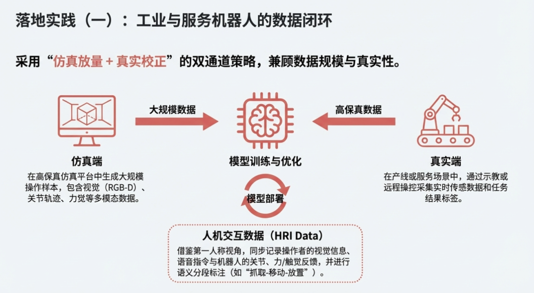 这些典型场景的共同特征是:传感器获取的高质量多模态数据 → 感知模块提取环境特征 → 决策模块生成行为策略 → 执行模块实施动作并反馈新数据,数据在闭环中不断沉淀,形成持续扩展的具身智能数据资产。特别是通过“仿真放量 + 真实校正”的方式,可以把数据和模型一起推向更高能力层级。