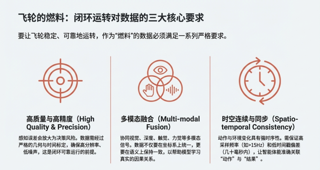 具身智能系统运行在一个高频循环的感知–决策–执行闭环之中:传感器持续采集环境与本体数据,经感知模块融合与表征后进入决策模块生成行为计划,随后由执行模块作用于环境,环境变化又通过传感器反馈回来。要让这个闭环稳定、可靠地运行,数据必须满足一系列严格要求。