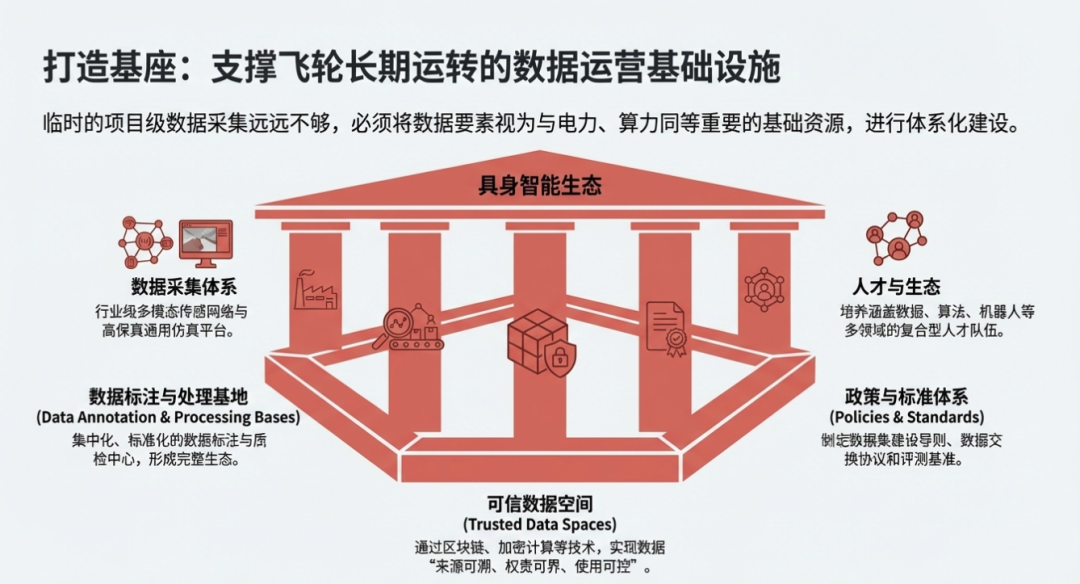 要支撑具身智能的长期发展,单个项目的临时数据采集远远不够,必须建设面向未来的“数据运营基础设施”,把数据要素当成和电力、算力一样的基础资源来规划。