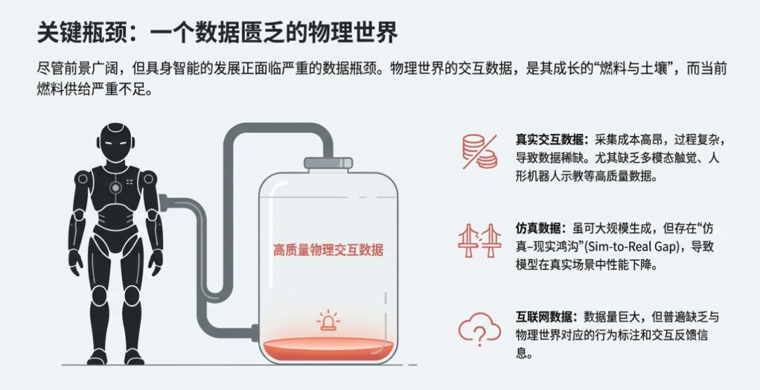 另一方面,仿真数据与真实数据各有短板。高保真仿真平台可以以较低成本产生大规模、多样化数据,但总存在“仿真–现实鸿沟”:模拟的物理特性、噪声分布与真实世界并不完全一致,导致模型迁移到现实场景时性能下降。互联网视频数据量虽大,却缺乏与之配套的行为标注和物理反馈信息,很难直接用于具身智能学习。
