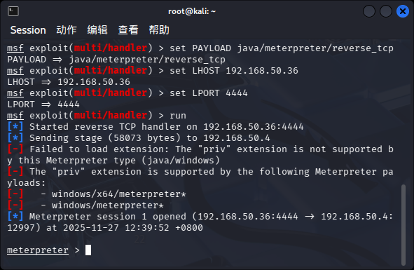 直接关闭当前msf终端,重新打开终端并配置参数。在不运行靶场shell文件的情况下,会自动获得会话。