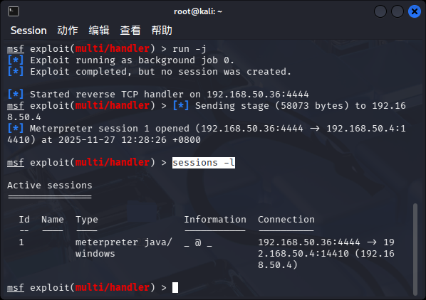 当得到会话请求后,我们可以利用sessions -l命令查看当前会话ID