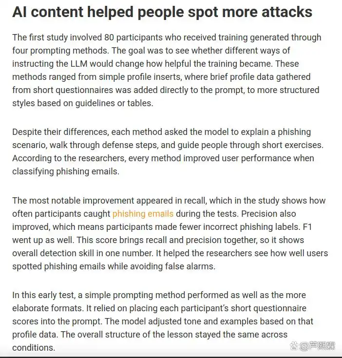 近年来,大语言模型(Large Language Models, LLMs)在文本生成、情境模拟和个性化交互方面展现出强大能力。理论上,LLM可动态生成贴近真实业务场景的钓鱼案例,并结合用户背景调整教学难度与风格。然而,其在安全教育中的实际效能尚未经过严格实证检验。尤其值得关注的是,若生成内容无意中复现真实企业流程或暴露内部术语,可能被攻击者反向利用,形成“训练即泄露”风险。