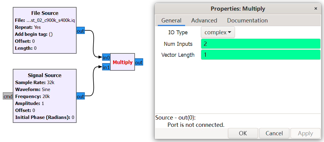 接下来放置一个 Multiply 模块,将 File Source 和 Signal Source 的输出(out)连接到 Multiply 模块的输入(in0 和 in1)