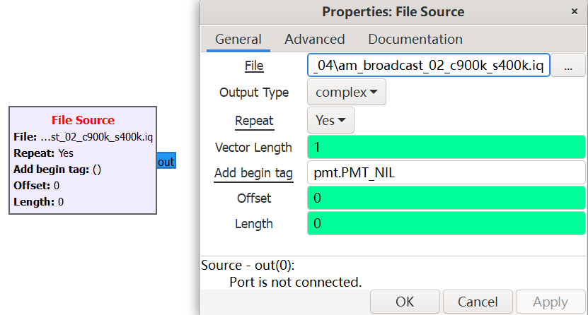 接下来添加数据源,为了方便没有硬件设备的朋友学习,原书的作者提供了预先录制的原始无线电数据,我给传到网盘了(见文末)因此我们可以直接使用 File Source 打开原始无线电数据,设置文件路径为:getting_started_sdr-main\ch_04\am_broadcast_02_c900k_s400k.iq,这里的 Repeat 选择了 Yes 表示会重复这段数据