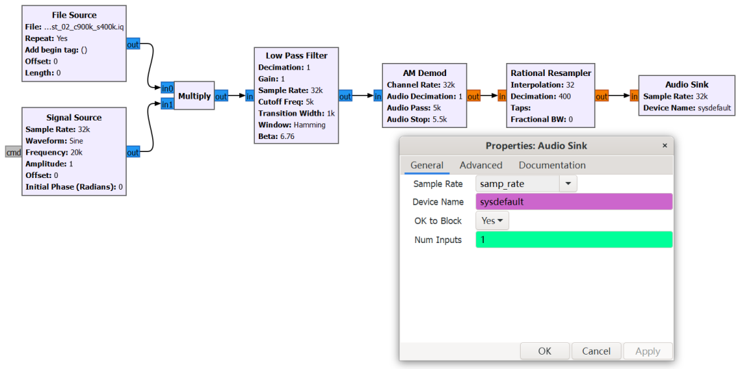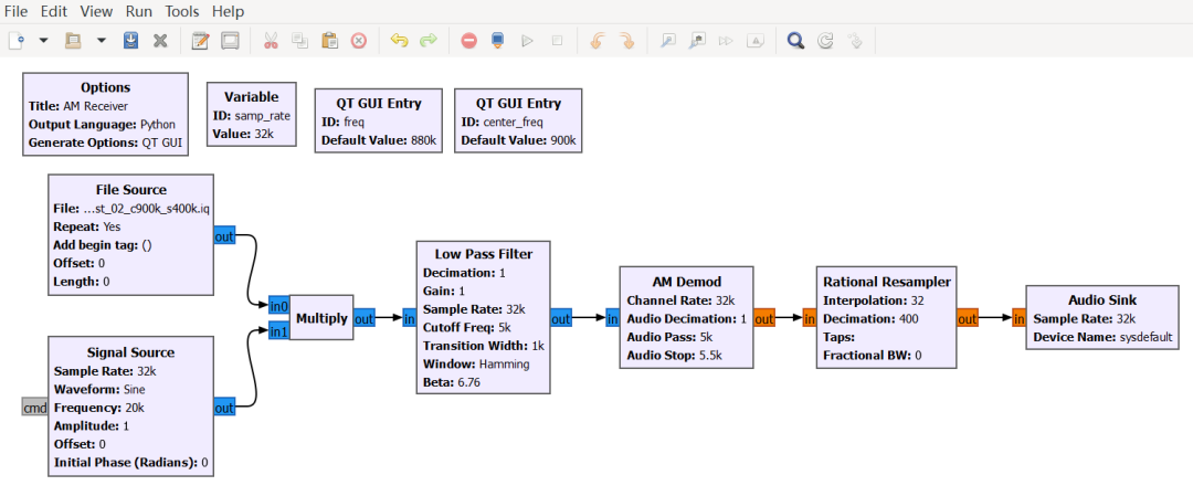 本文将构建一个 AM 接收器,实现从 AM 信号中解调出音频信号,类似收音机的效果,但却是从之前保存的 AM 信号文件中解析,不使用 SDR 设备空口实时捕获,此过程暂不过多介绍具体原理,先搭建流程图,后面慢慢补充