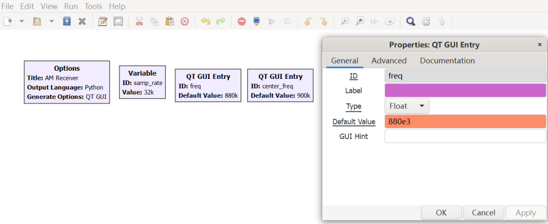 添加两个 QT GUI Entry 模块,这个模块与变量模块类似(不同的是 QT GUI Entry 模块可以在流程图运行时动态的修改,Variable 则不能)一个名为 freq,默认值设置为 880e3Hz;一个名为 center_freq,默认值设置为 900e3Hz