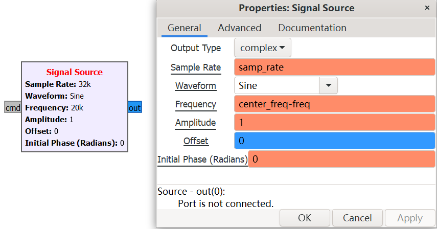 然后添加一个信号源(Signal Source)用来生成正弦波,频率设置为 center_freq - freq,这里你应该可以发现,GNU Radio 中是支持使用变量进行运算的,所以说前面定义的变量就很方便了