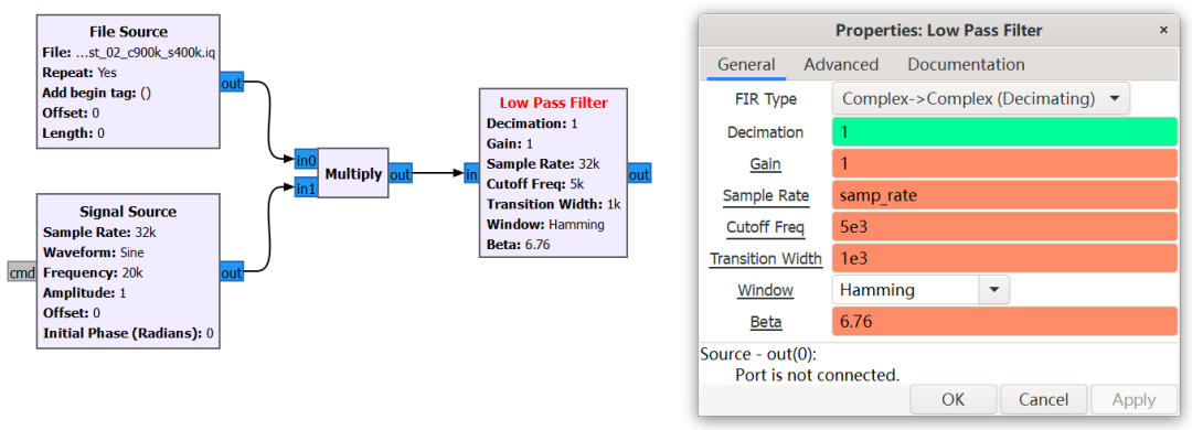 添加一个 Low Pass Filter 低通滤波模块,设置截止频率 5e3Hz、带宽 1e3Hz,然后将低通滤波器的输入连接到 Multiply 模块的输出