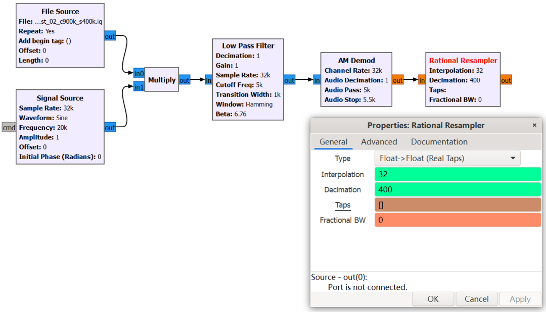 接下来放置一个 Rational Resampler(有理数重采样器),Interpolation 插值设置为 32,Decimation 抽取设置为 400,这将调整音频信号的采样率,以便电脑声卡可以播放它,将它的输入连接到 AM Demod 的输出