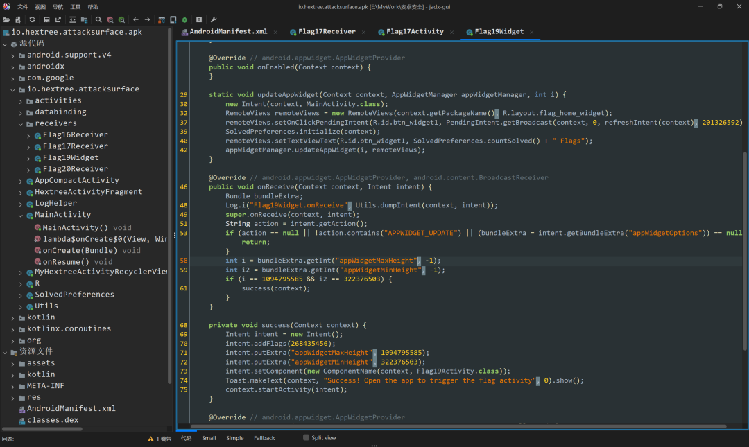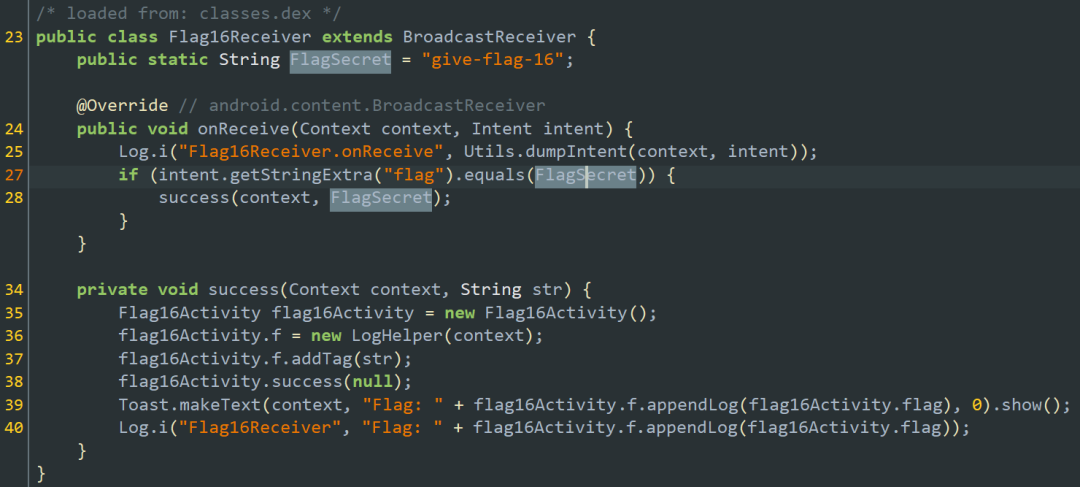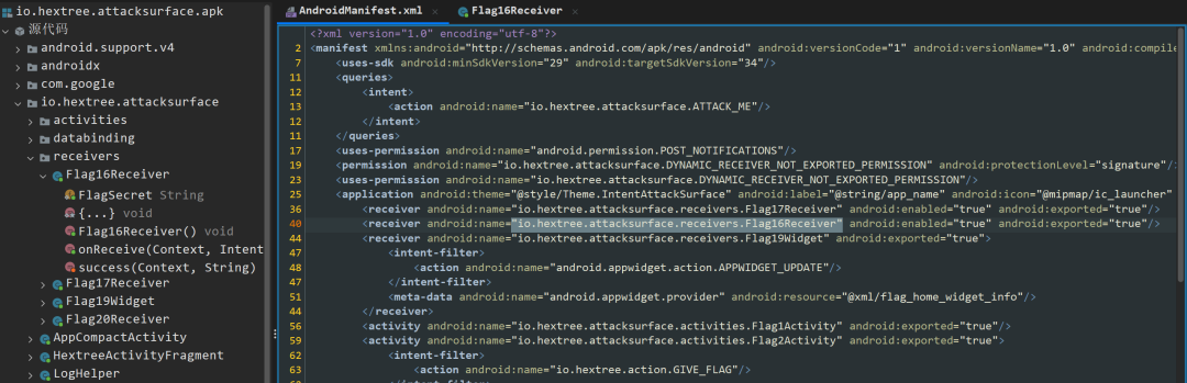 继续看 io.hextree.attacksurface 的这个示例程序,首先看一下 io.hextree.attacksurface.receivers.Flag16Receiver