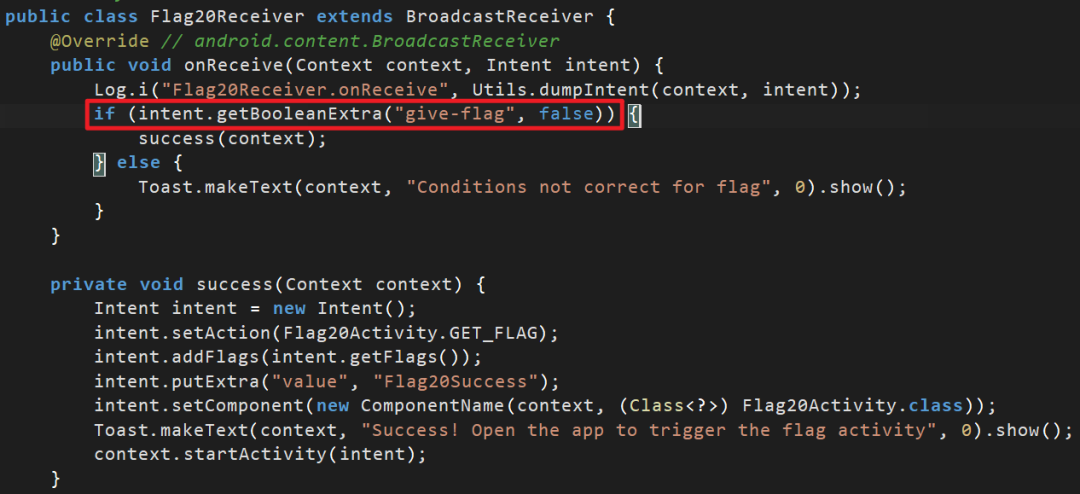 所以 Flag20Receiver 动态实例会优先接收到这个广播消息,然后解析其中的数据,判断是否包含额外数据 :"give-flag" 若包含则成功