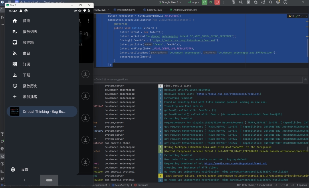 因此可以发送一个广播动作 de.danoeh.antennapdsp.intent.SP_APPS_QUERY_FEEDS_RESPONSE 来添加一个订阅,修改 POC 如下: