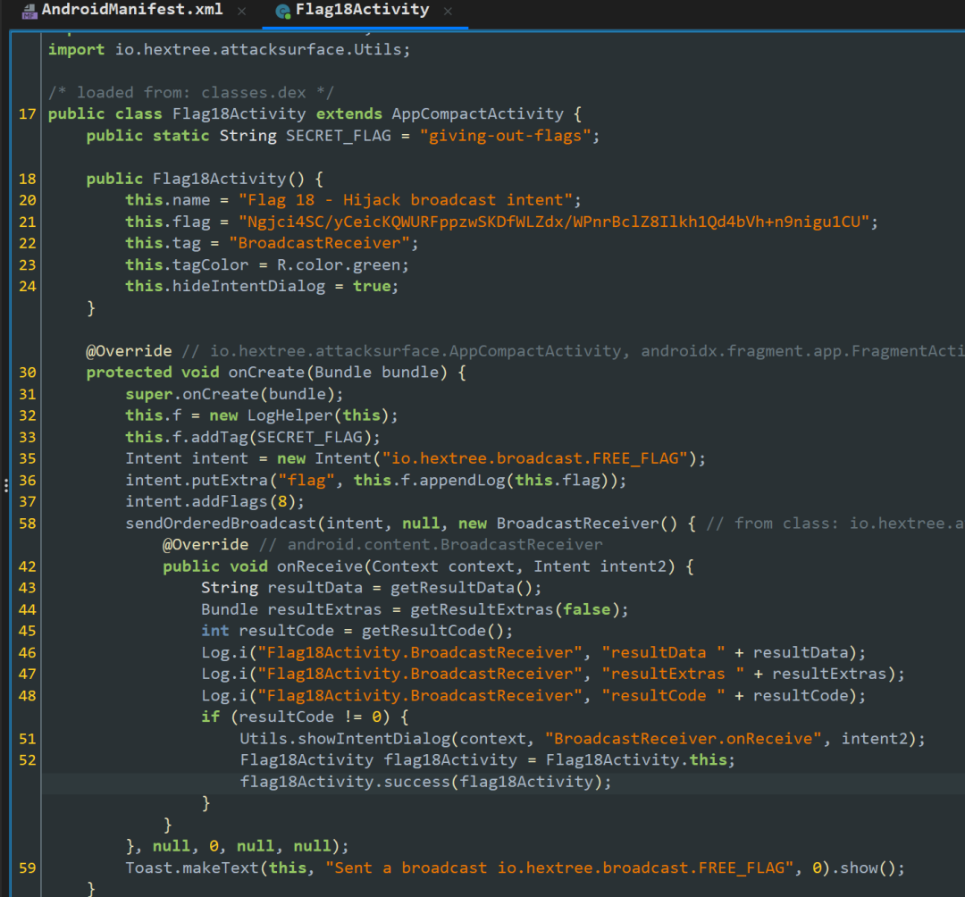 Flag17Receiver 会先接收一个 OrderedBroadcast 然后判断里面有没有 give-flag-17,如果有就调用 flag17Activity 中的 success 函数,通过广播再发回去,因此编写 POC 发送一个广播,然后再监听就可以收到了