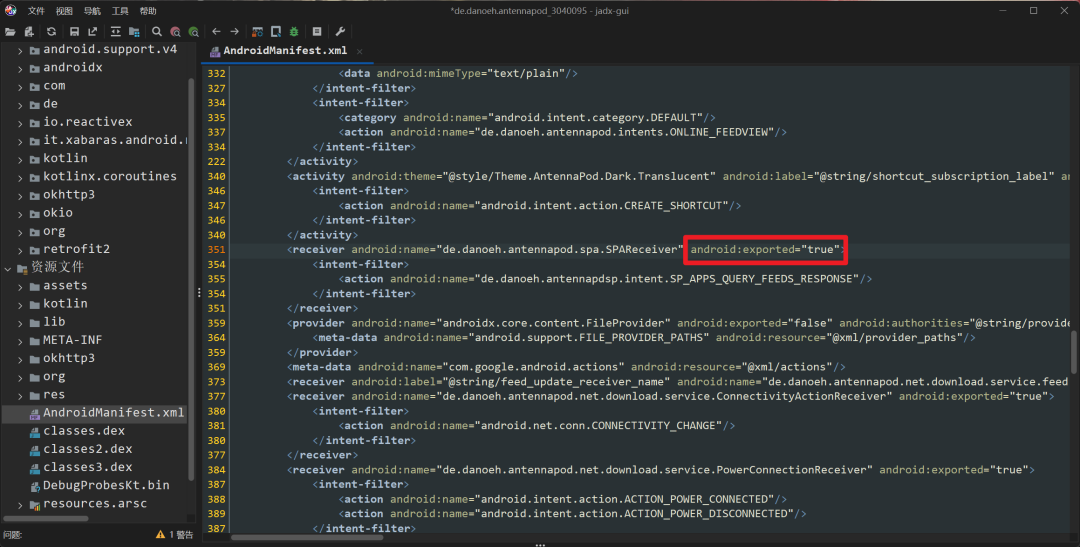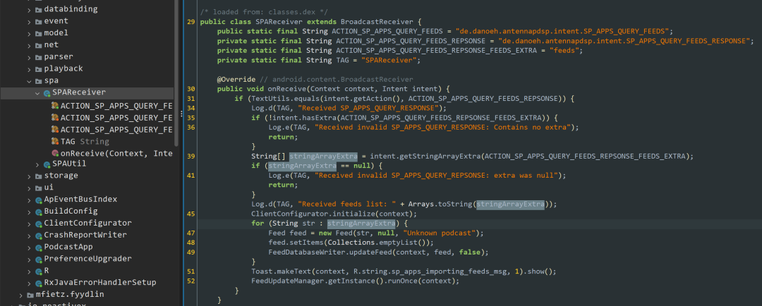 在上面这个 APP 的例子中 de.danoeh.antennapod.spa.SPAReceiver 导出设置为 true,当接收到广播时会先判断是不是:de.danoeh.antennapdsp.intent.SP_APPS_QUERY_FEEDS_RESPONSE 广播动作,如果是则检查是否含有 ACTION_SP_APPS_QUERY_FEEDS_REPSONSE_FEEDS_EXTRA 数据(feeds)如果有则提取订阅列表数据,然后用 FeedDatabaseWriter.updateFeed 更新订阅