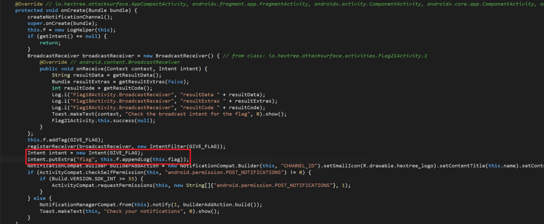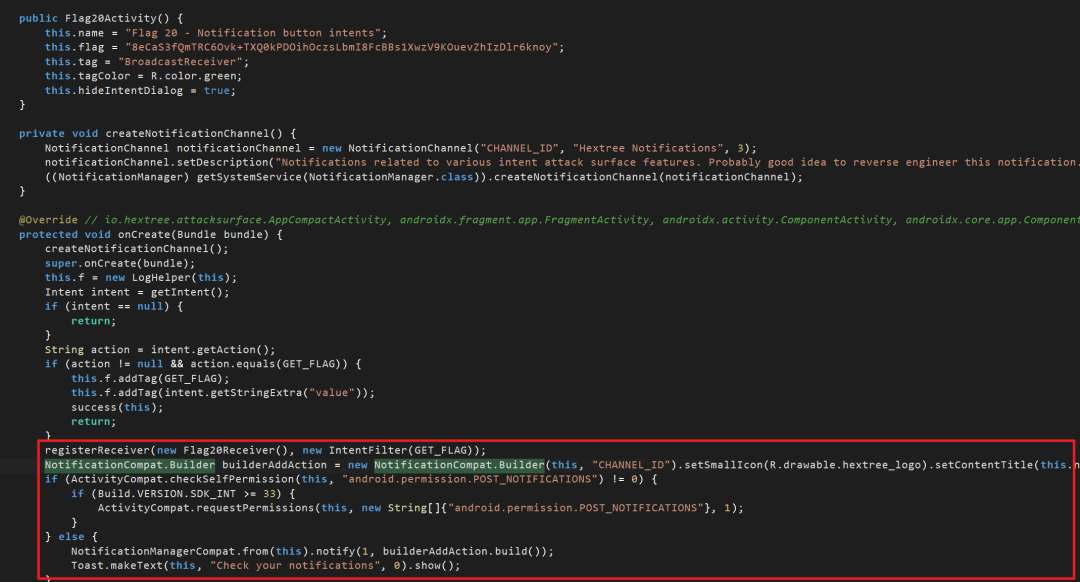 通过 jadx 逆向发现这一关卡通过 NotificationCompat.Builder 创建了一个通知消息,当点击该消息上的按钮时会发送一条广播,又因为通过 registerReceiver(new Flag20Receiver(), new IntentFilter(GET_FLAG)); 动态注册了接收器:Flag20Receiver