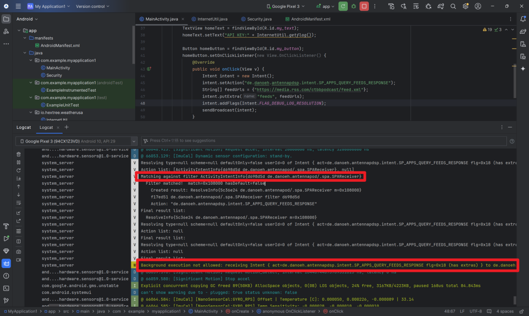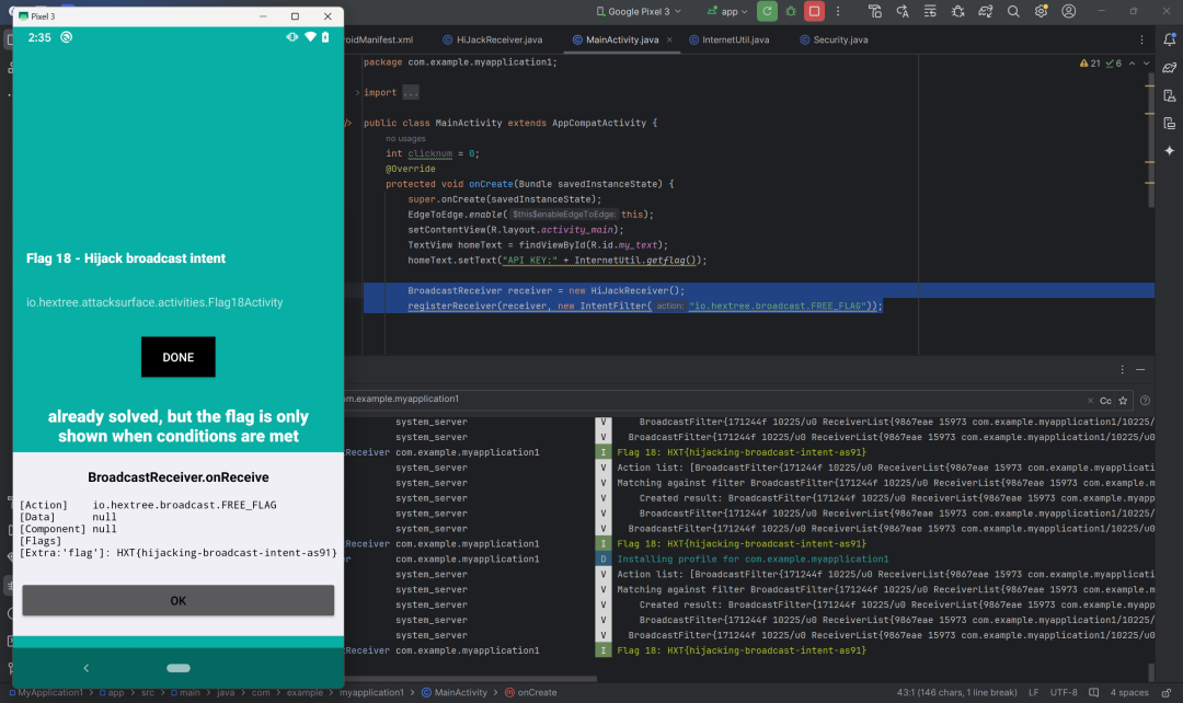 在 MainActivity 中注册接收器,然后运行,当点击 Flag 18 时即可在 logcat 中看到了,同时题目通关也可以看到结果