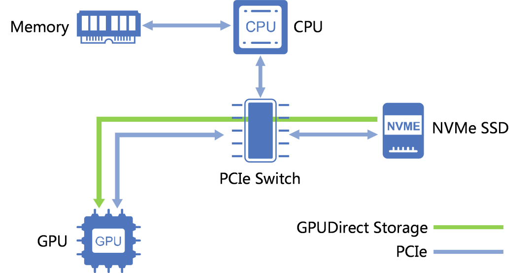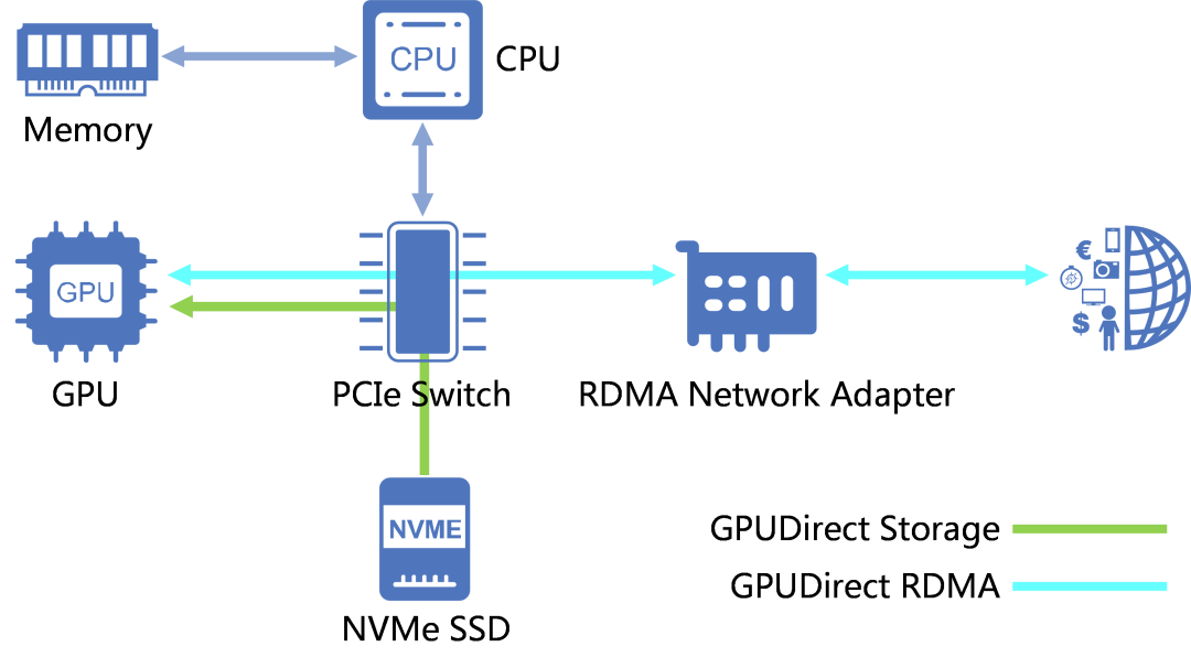 • 更高的带宽利用率:消除传统I/O路径(存储→内存→GPU)的两次数据拷贝,PCIe带宽利用率显著提升。