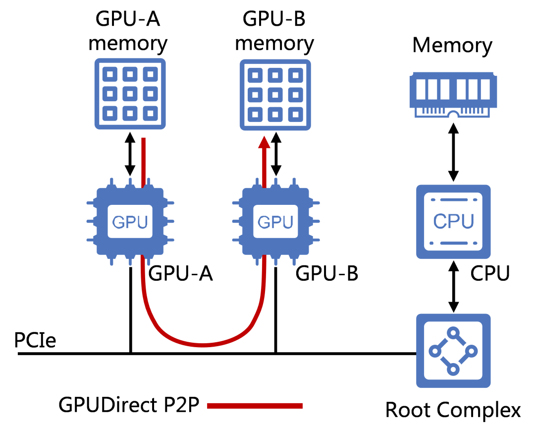 GPUDirect P2P(Peer-to-Peer,点对点)是NVIDIA基于PCIe P2P标准在GPU架构上实现的优化扩展,支持同一主机内的多块GPU通过PCIe/NVLink总线直接读写彼此显存,无需通过主机内存中转,实现多GPU数据分发加速。