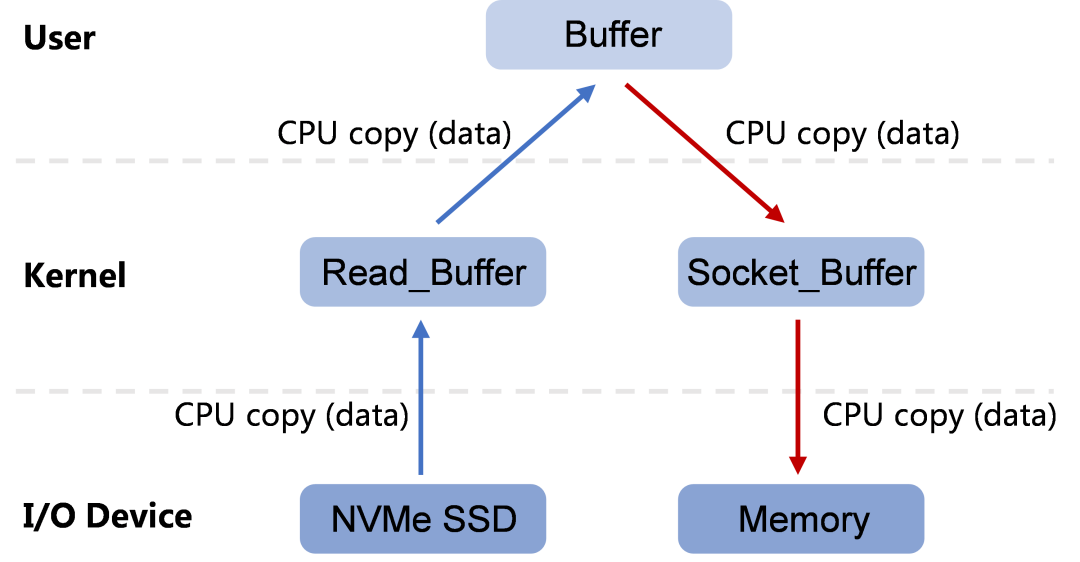 • DMA传输阶段:存储设备(如NVMe SSD)通过DMA将数据传至主机内存的Bounce Buffer。此阶段CPU需完成内存分配、传输指令初始化等调度工作。