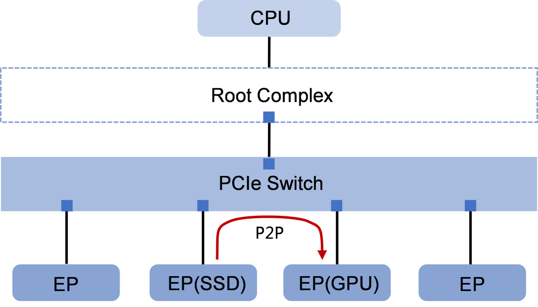 PCIe P2P通信通过PCIe Switch实现多个端点设备(EP)间的内部路由。当SSD与GPU等端点设备需要传输数据时,PCIe Switch可建立点对点专属通道,绕过主机内存实现设备级直通传输。
