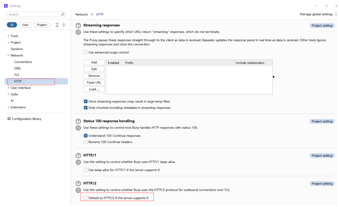 打开 Burp → Settings → HTTP → HTTP/2,把下图选项 取消勾选(禁用 HTTP/2)。