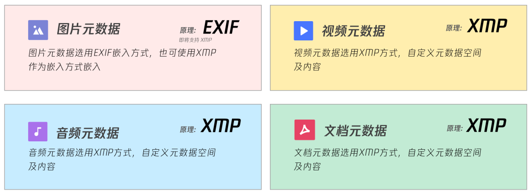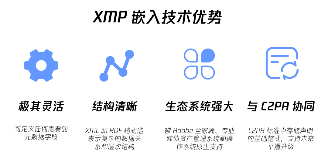 选用 XMP:可灵活嵌入创作标识、权属信息、编辑记录等多元内容,不仅能在格式转换、跨平台传输中稳定保留关键数据,为版权溯源与合规管理提供可靠支撑,还支持自定义字段适配图片、音频、视频等各类 AIGC 场景。