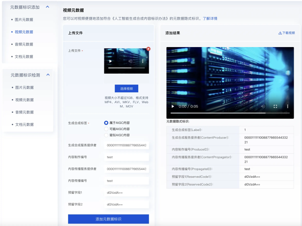在图片像素里嵌入隐形水印元数据,把合成标签、合成服务提供者、制作编号、传播编号、服务传播编号等这些细节藏进去,为安全合规提供保障。以下是视频元数据添加效果图。