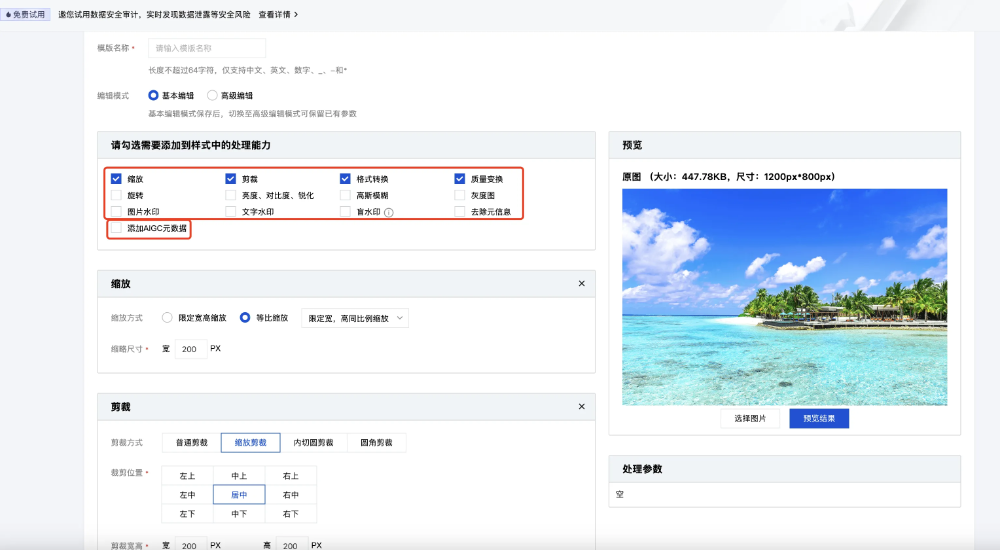针对图片处理,我们进一步融合了更丰富的图片处理能力。可在流程中创建模板,不仅能添加 AIGC 元数据,还可进行多项图片配置,充分体现控制台工作流在图片处理方面的灵活性。