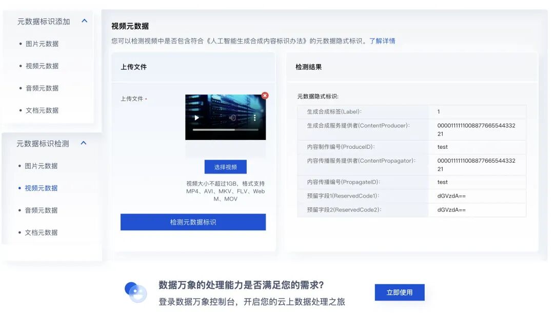 数据万象体验馆已全面支持图片、音视频及文档的 AIGC 合规打标和检测,如需体验相关功能,欢迎前往数据万象体验馆进行操作。