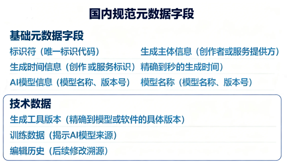 基于元数据的国内规范:2025年3月7日,我国互联网信息办公室联合工业和信息化部、公安部、国家广播电视总局正式发布《人工智能生成合成内容标识办法》,正式出台了一系列针对元数据字段的规范条文。