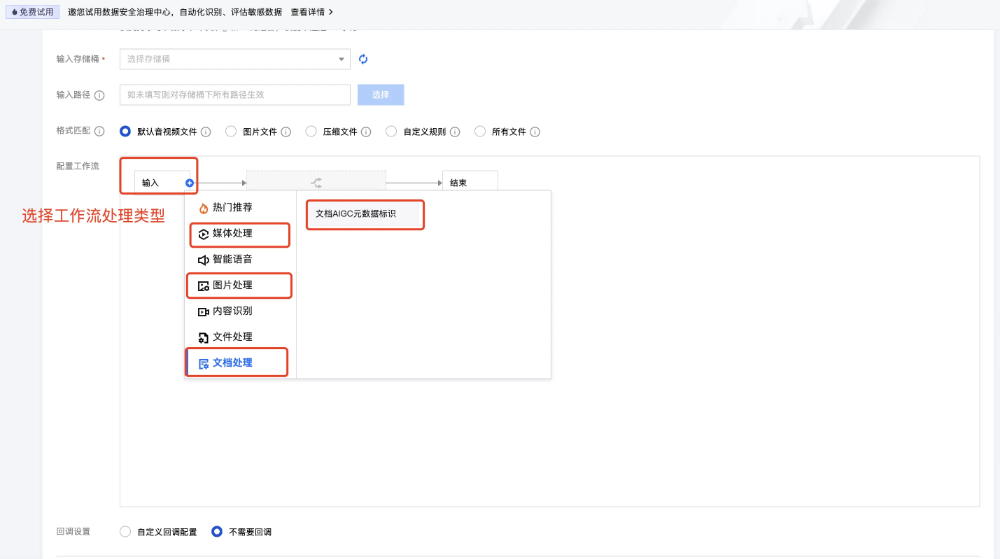 对于音视频 AIGC 元数据的处理能力,选择音视频相关处理,即可完成打标工作。
