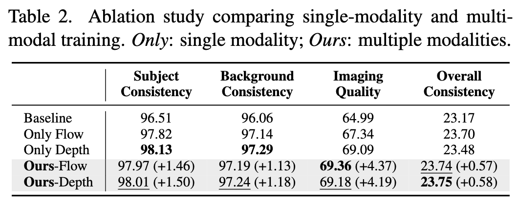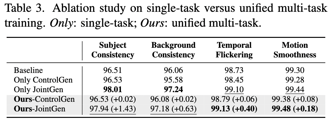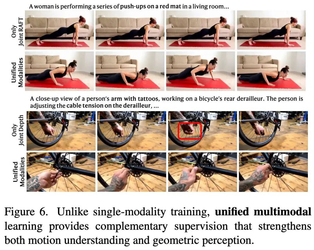 图 2.统一模式的培训有利于视频生成。 统一的多模态和多任务联合训练在 RGB 视频生成上实现了最低的最终损失,优于单模态联合训练和 RGB 微调基线。